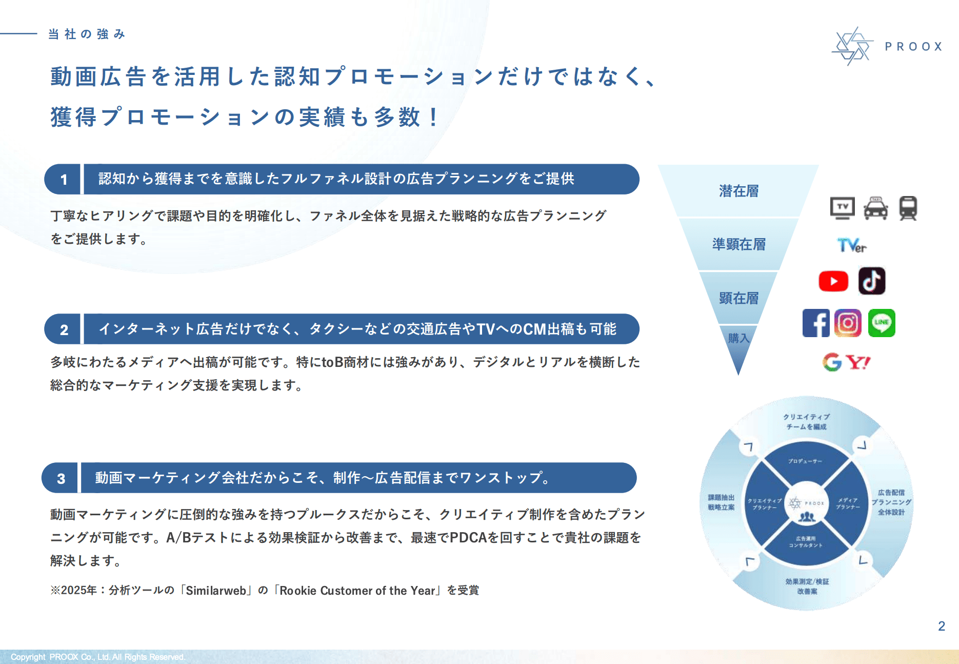 プルークスの広告配信サービスをまとめたご紹介資料です。Webサイトでは公開していない詳細な取引実績、対応可能な媒体、費用感などを分かりやすく解説しています。プルークスでは、制作した動画を活用した動画広告の一気通貫した運用はもちろん、リスティング広告をはじめとする獲得系施策まで含めたフルファネル支援を提供しています。